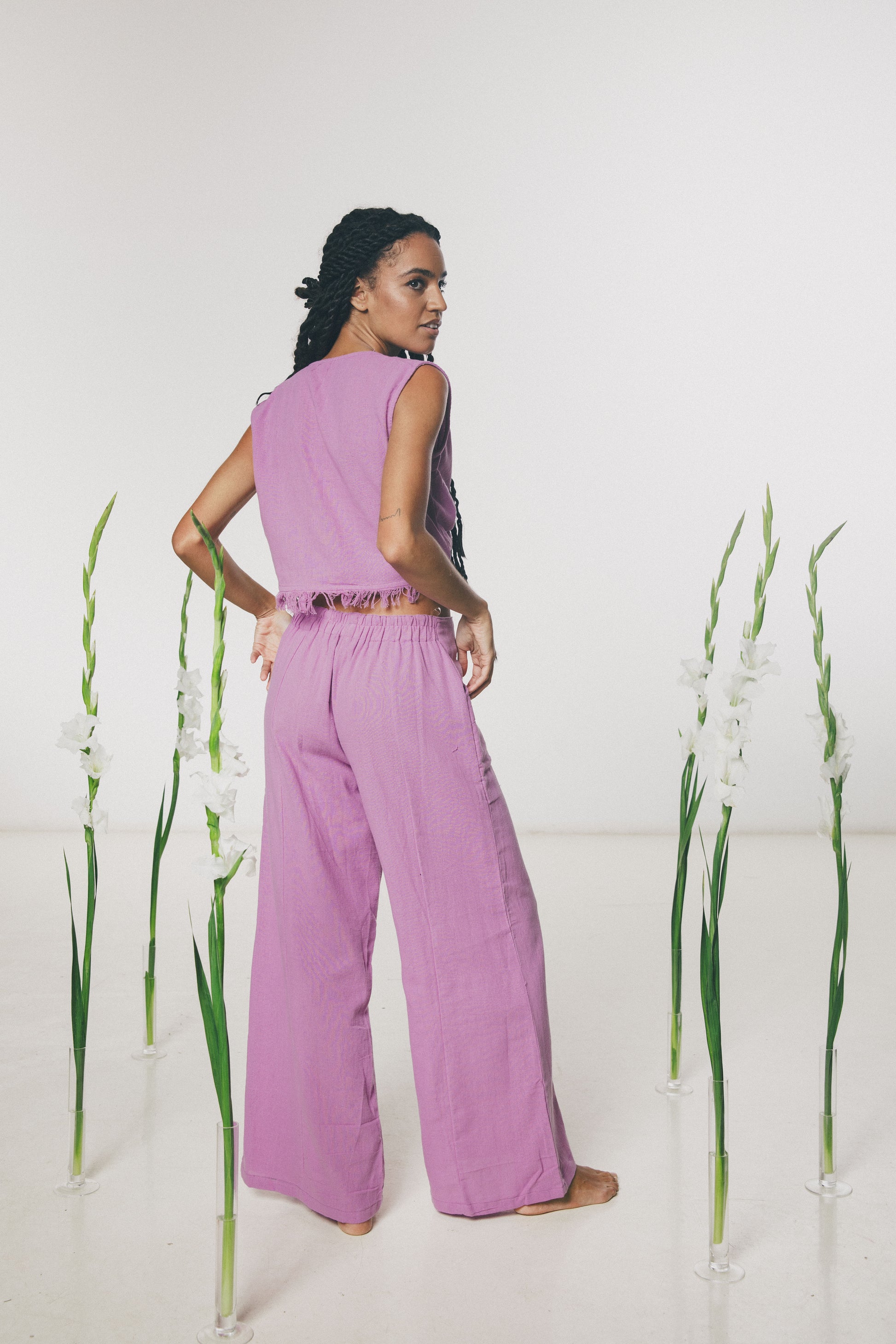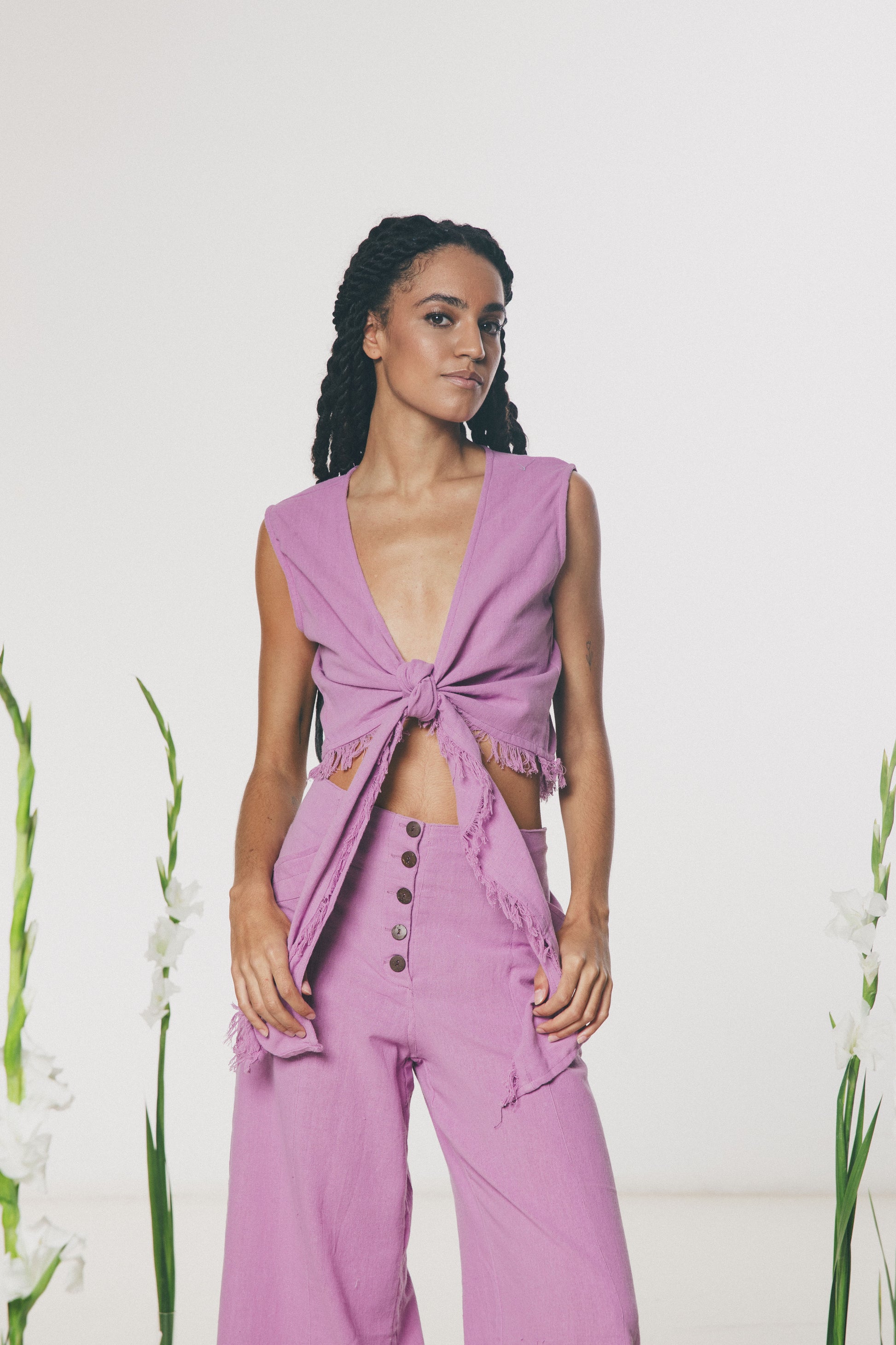 Vibrante, cómodo y lleno de personalidad: este conjunto en tono lila es perfecto para expresar estilo sin esfuerzo. Confeccionado en algodón de textura suave y ligera, está compuesto por un top sin mangas con escote profundo, que se anuda al frente y remata con un delicado detalle de flecos artesanales en el bajo.