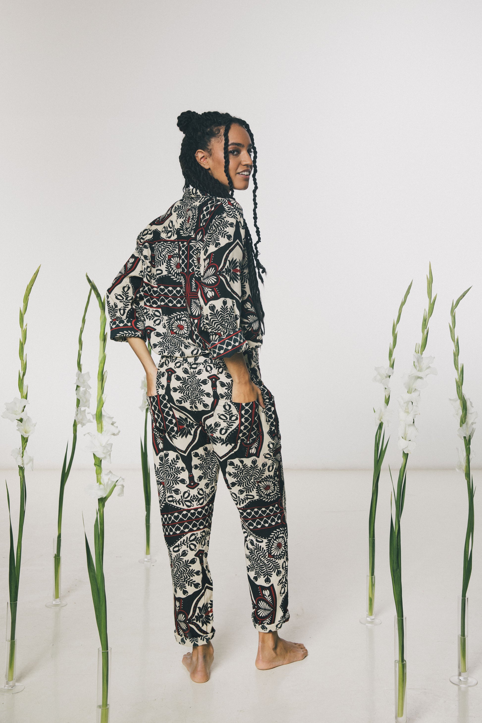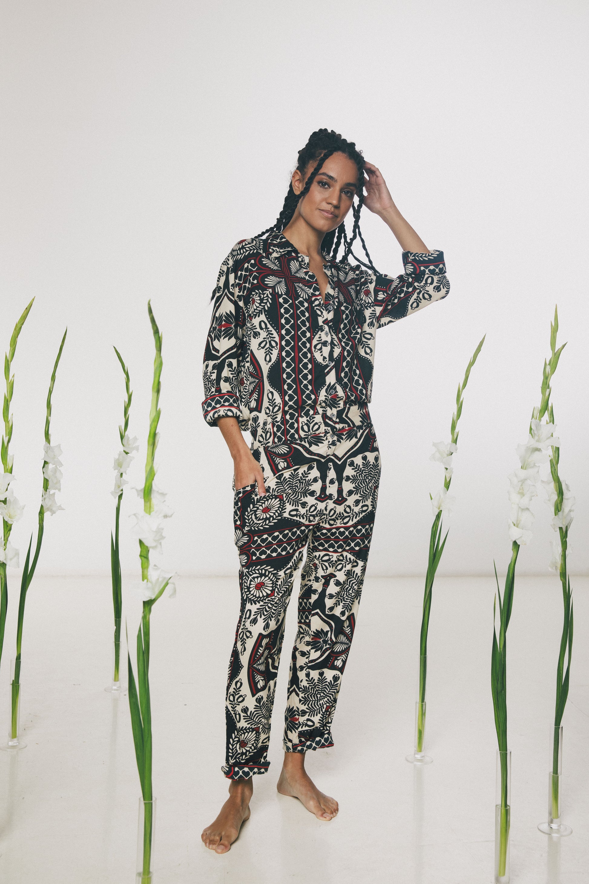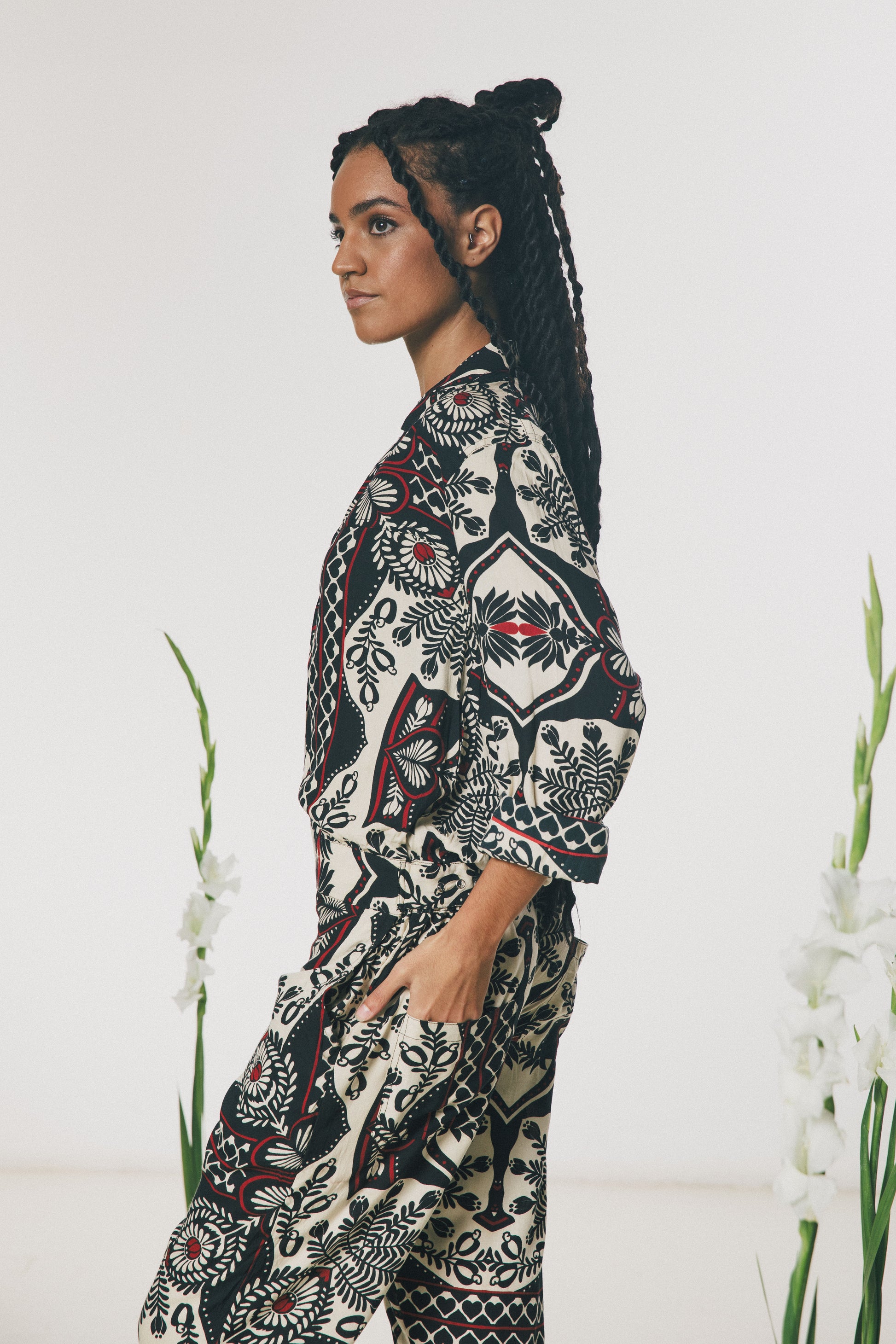Mono largo de silueta relajada con estampado étnico en tonos negro, rojo y crudo. Su diseño cómodo y versátil incluye botones frontales, mangas largas con vuelta y el pantalón es de corte recto, con elástico en la parte de detrás de la cintura, ajustable con botones laterales y bolsillos traseros. Ideal para usar tanto de día como de noche, aportando estilo con el mínimo esfuerzo.