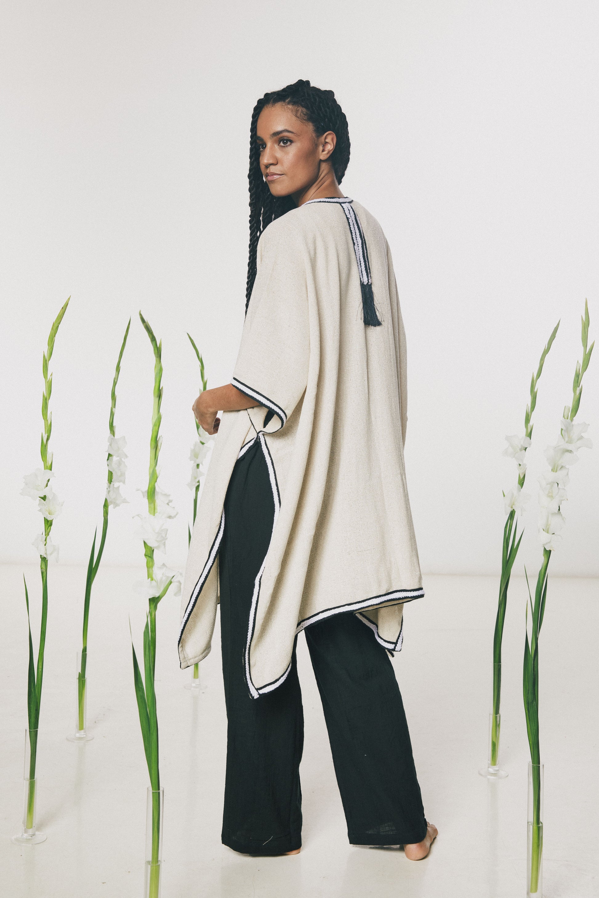 Poncho tipo túnica en tono crudo con ribetes en contraste, de diseño amplio y cómodo. Confeccionado en tejido suave y ligero, es perfecto para usar como capa exterior sobre básicos. Su caída fluida y silueta oversize aportan un estilo relajado y contemporáneo.